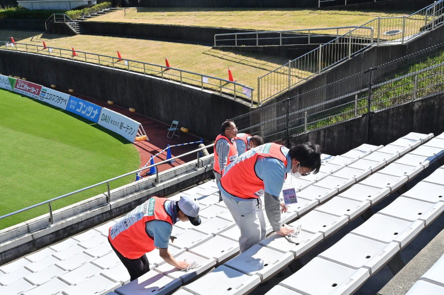サポーターが安心・安全に、そして楽しく観戦できるよう、1席1席丁寧に消毒を行いました✨