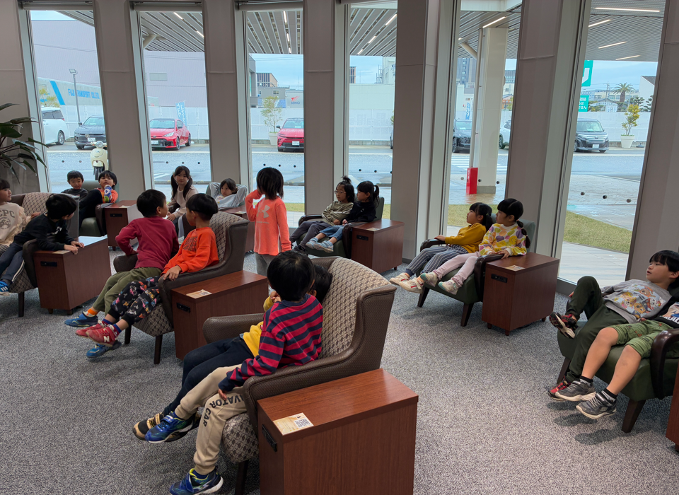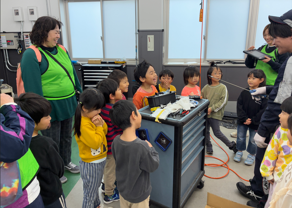 ショールームやサービス工場を見学してもらい、スタッフのお仕事や車のことについて楽しく学んでくれました。